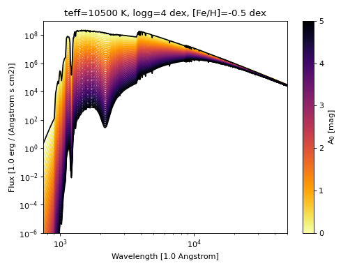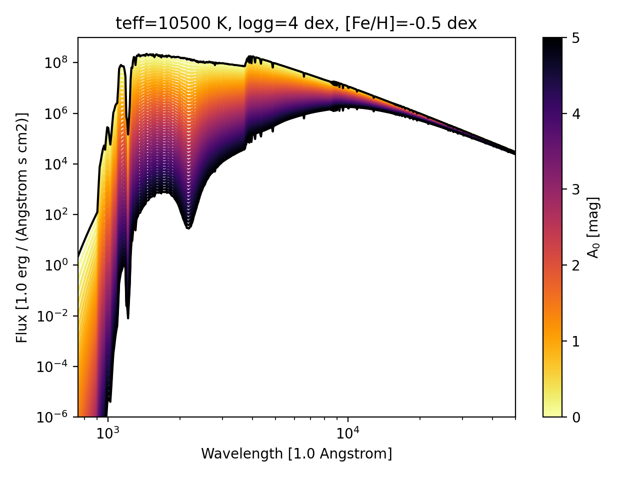 If we assume \(F_\lambda^0\) is the intrinsic atmosphere energy distribution of a star as a function of wavelength \(\lambda\) and the extinction curve \(\tau_\lambda\), the apparent wavelength-dependent light observed from a star is given by: