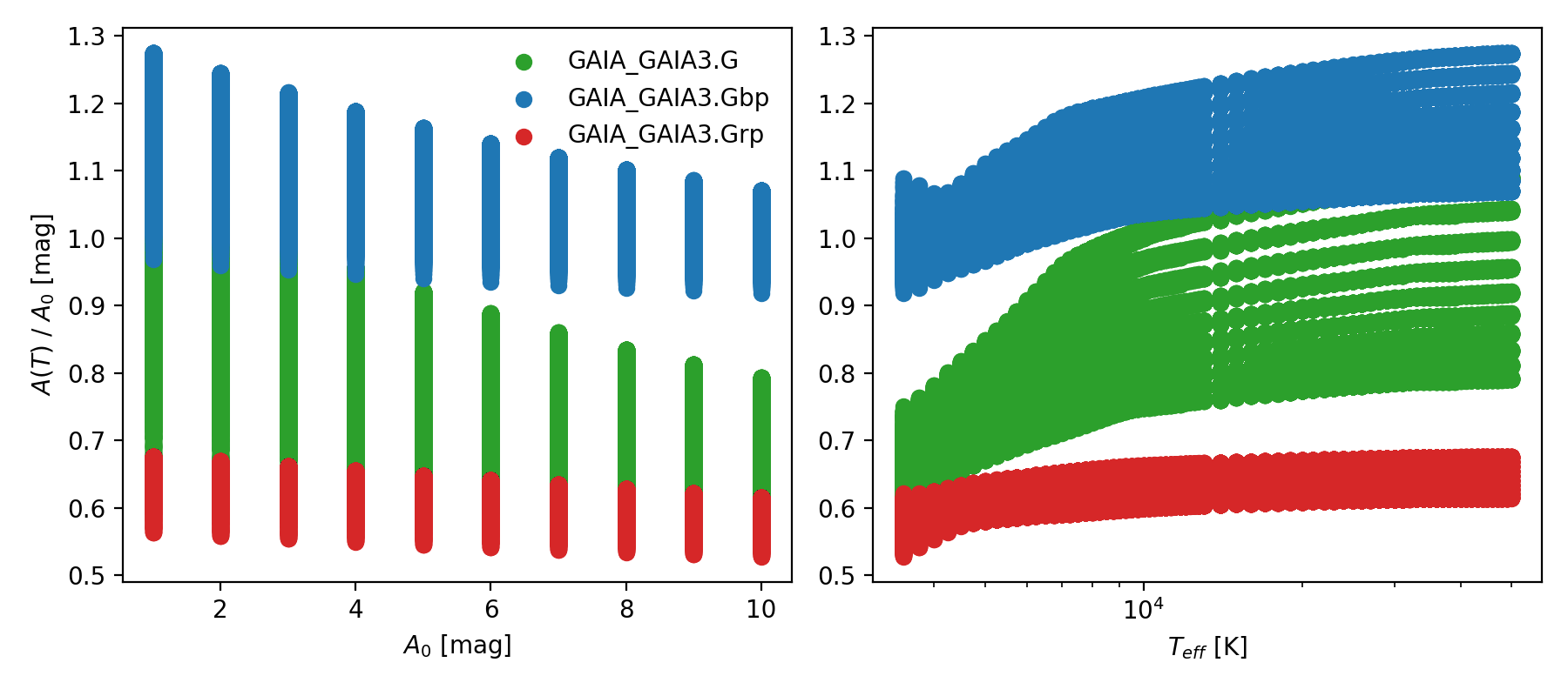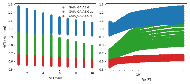 Fig. 13 Figure 2. Integrated extinction effect in the Gaia G, BP and RP bands. The left panel illustrates that \(A(T)\) is not a simple rescaling of \(A_0\) but a distribution of values (the black line indicates the identity line). The right panel illustates that the distribution of \(A(T)/A_0\) depends strongly on the temperature \(T_{eff}\), i.e. the shape of the SED throught the passband \(T\)#