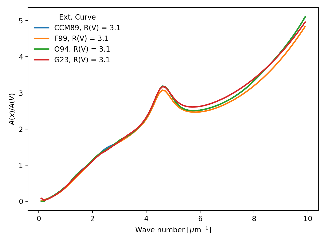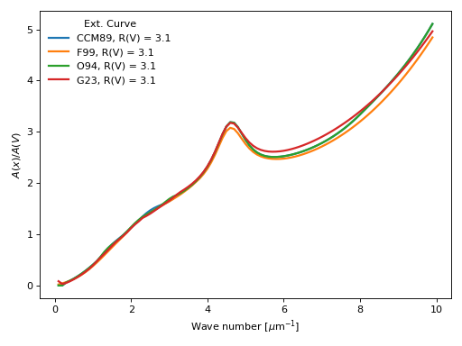 The observations show a wide range of dust column normalized extinction curves, \(A(\lambda) / A(V)\). This package provides a common interface to many commonly used extinction curves.