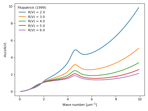 import numpy as np import matplotlib.pyplot as plt import astropy.units as u from dustapprox.legacy_extinction import F99 #define the wave numbers x = np.arange(0.1, 10, 0.1) # in microns^{-1} lamb = 1. / x * u.micron c = F99() Rvs = np.arange(2, 6.01, 1.) for Rv in Rvs: plt.plot(x, c(lamb, Rv=Rv), label=f'R(V) = {Rv:0.1f}', lw=2) plt.xlabel(r'Wave number [$\mu$m$^{-1}$]') plt.ylabel(r'$A(x)/A(V)$') plt.legend(loc='upper left', frameon=False, title='Fitzpatrick (1999)') plt.tight_layout() plt.show()