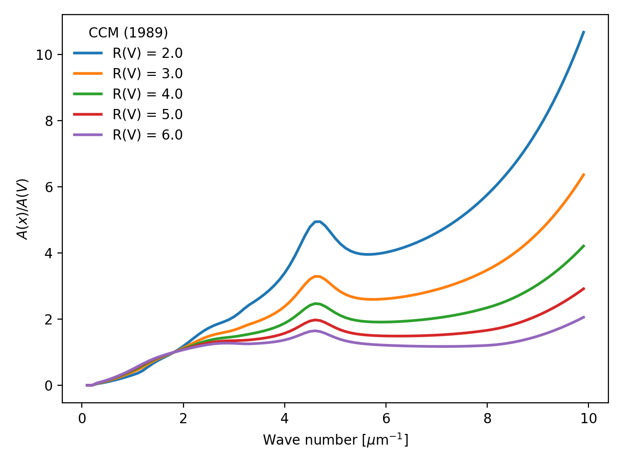 import numpy as np import matplotlib.pyplot as plt import astropy.units as u from dustapprox.legacy_extinction import CCM89 #define the wave numbers x = np.arange(0.1, 10, 0.1) # in microns^{-1} lamb = 1. / x * u.micron c = CCM89() Rvs = np.arange(2, 6.01, 1.) for Rv in Rvs: plt.plot(x, c(lamb, Rv=Rv), label=f'R(V) = {Rv:0.1f}', lw=2) plt.xlabel(r'Wave number [$\mu$m$^{-1}$]') plt.ylabel(r'$A(x)/A(V)$') plt.legend(loc='upper left', frameon=False, title='CCM (1989)') plt.tight_layout() plt.show()